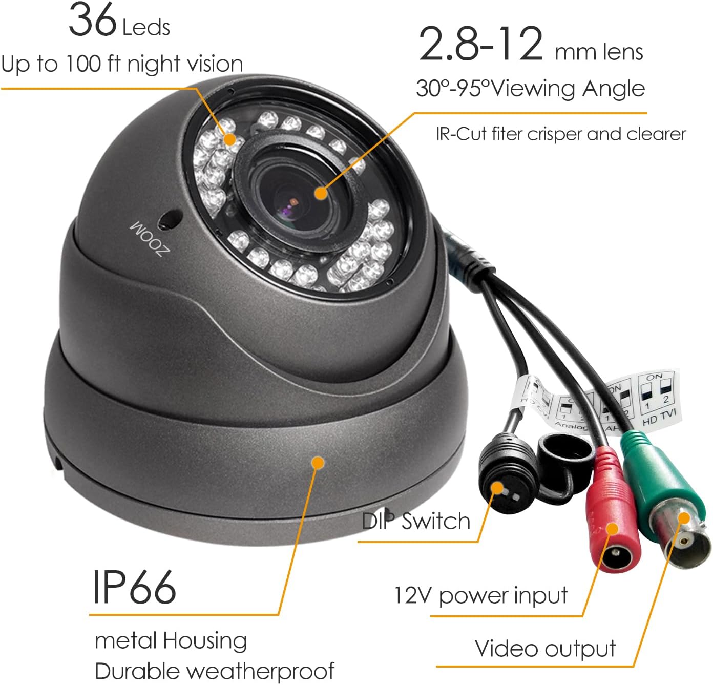 Analog CCTV Camera HD 1080P 4-in-1 (TVI/AHD/CVI/CVBS) Security Dome Camera Outdoor, 2.8mm-12mm Manual Focus/Zoom Varifocal Lens, Weatherproof Metal Housing 36 IR-LEDs Day & Night Monitoring (Grey)