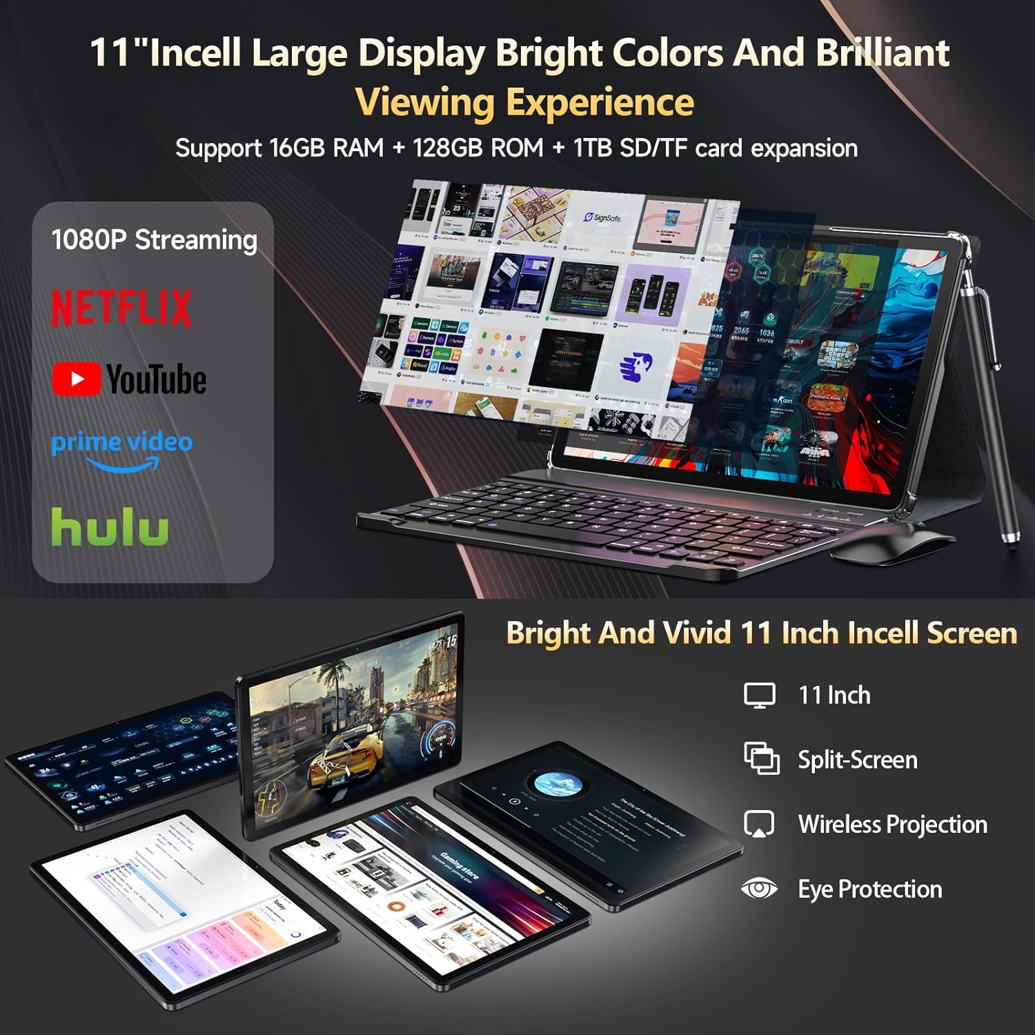 💡【Upgraded 11 inch Incell Large Screen + 21MP Dual Cameras 】11 inch tablet uses a fully laminated embedded Incell display with a resolution of 1280×800, brilliant colors and comfortable touch. The picture is more realistic, more shocking, and clear in details, allowing you to immerse yourself in vibrant visual effects. It has an eye protection mode that can effectively relieve eye fatigue and is ideal for late-night reading or browsing.Equipped with 13MP+8MP dual cameras, clearly capture every wonderful moment. The dual speaker design brings richer sound effects, whether you are watching videos or listening to music, you can enjoy the BOX sound effects.