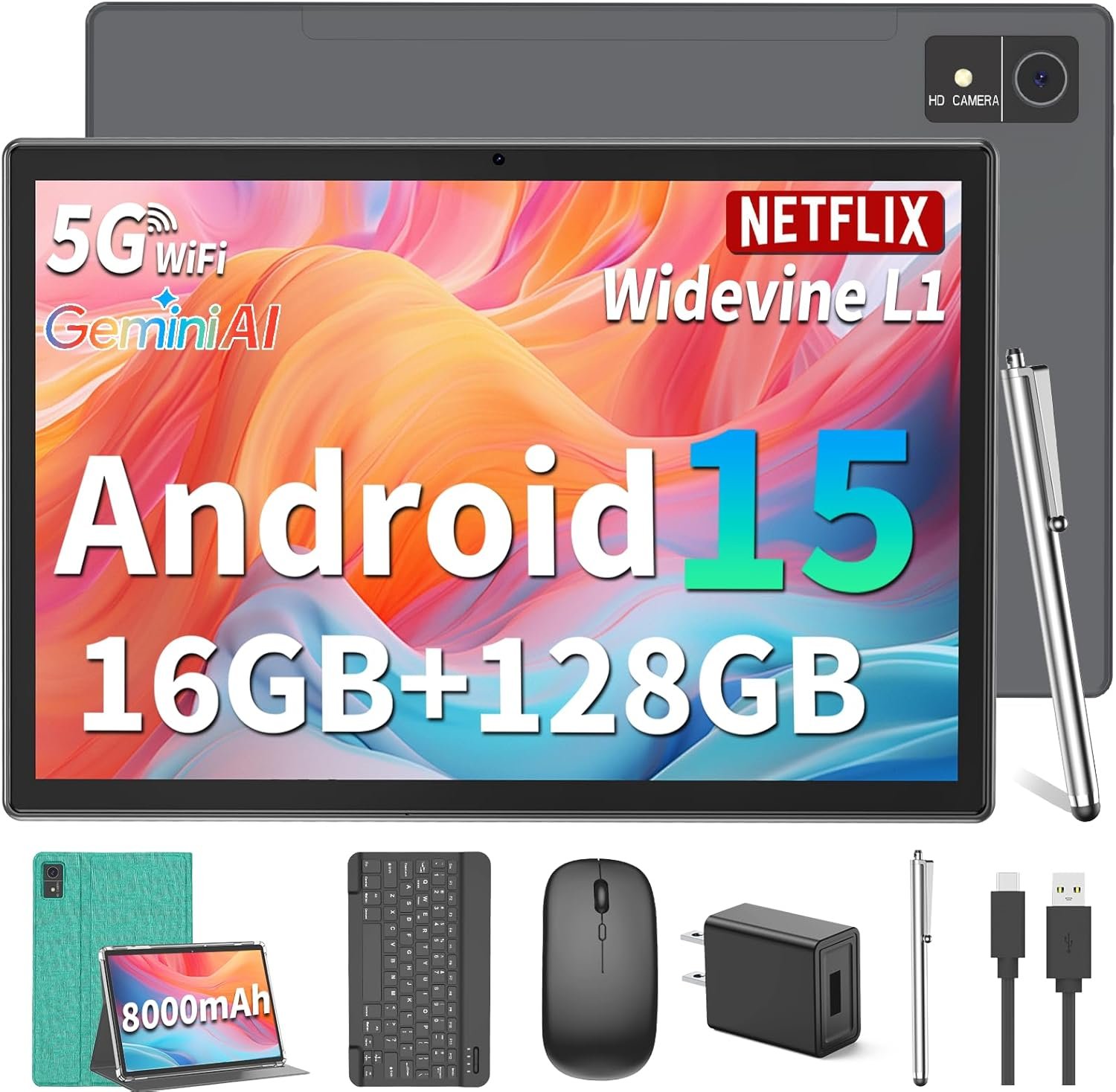Android 15 Tablet with Keyboard – 10 inch Tablet, 16GB+128GB, 1TB Expand, Octa-Core, 2.4G/5G WiFi, 8000mAh, BT V5.0, GMS, Widevine L1, Split-Screen, with Case, Mouse, Stylus(Green Case)