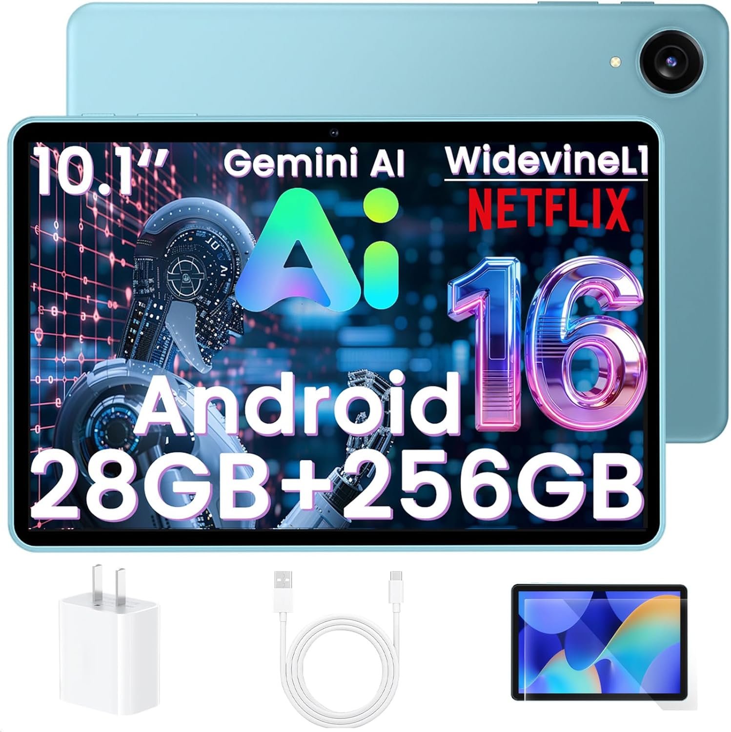 Android 16 Tablet – 10.1 Inch Tablets, 28GB RAM 256GB ROM 2TB Expand, 1280×800 HD IPS Touch Screen, Gemini AI, Octa-Core, Widevine L1, 6000mAh Battery, BT 5.0, 5G WiFi & GPS – Blue