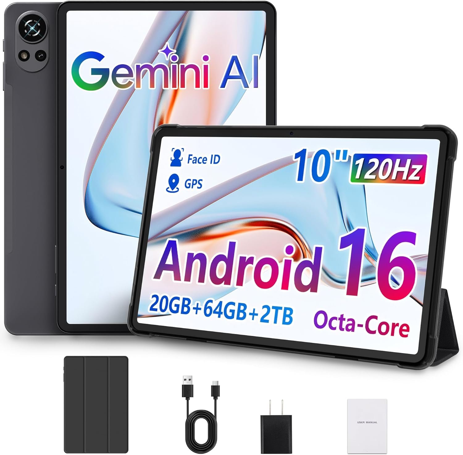 Android Tablet 10 Inch Tablets Android 16, Gemini AI, 120Hz Display, 20GB RAM, 64GB ROM+2TB Expandable, Widevine L1, 6000mAh, GPS, Face ID, Parent Control tablets with Case for Gaming, Car & Home