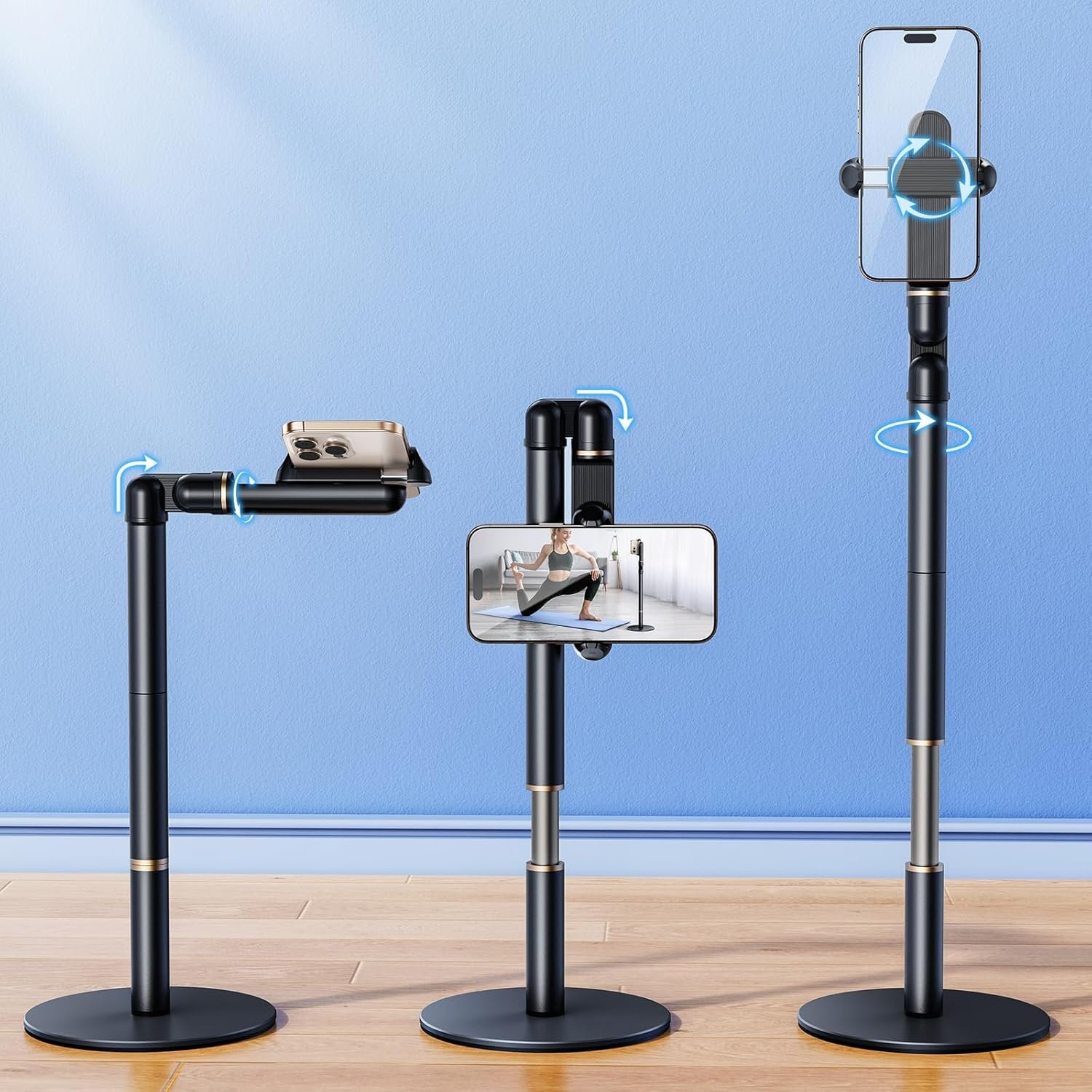 [ Extended Overhead Arm ] — Compare to cell phone mounts on the market, our desktop phone holder for video recording has a longer overhead arm, the overhead space will not be limited, and the overhead area is bigger for better video recording.