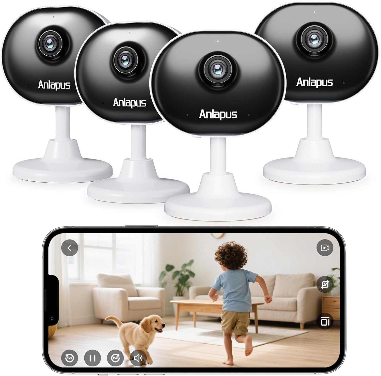 Anlapus A62 4 x 2MP Plug-in WiFi Indoor Camera for Home Security, Pet Camera with Phone App, Smart Motion/Person Detection, 2 Way Audio, Baby Monitor, Memory Card/Cloud Storage, Easy & Quick Install