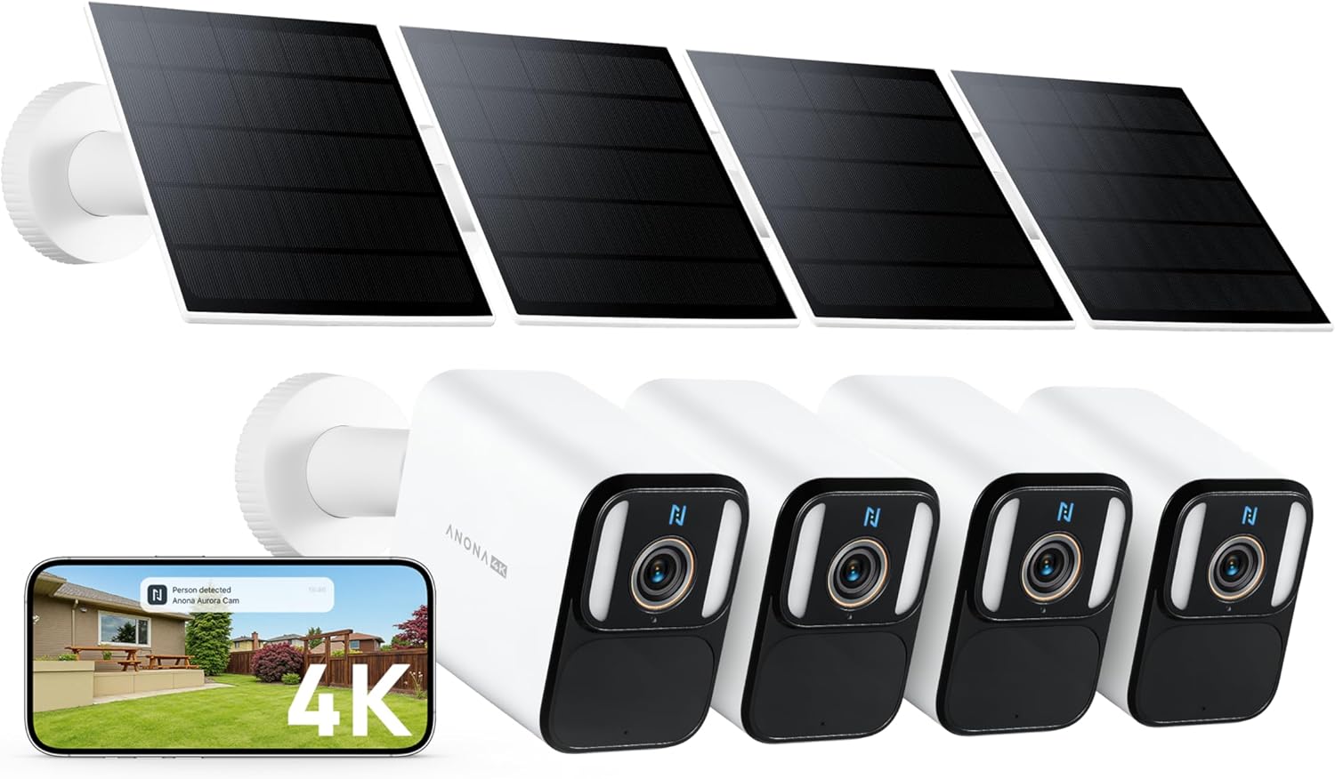 Anona 4K Solar Security Cameras Wireless Outdoor, Forever Power with Solar Panel, 8MP Color Night Vision, 24/7 AOV Recording, No Monthly Fees, AI Detection, Easy Setup, 2.4 G WiFi, IP67, 4 Pack