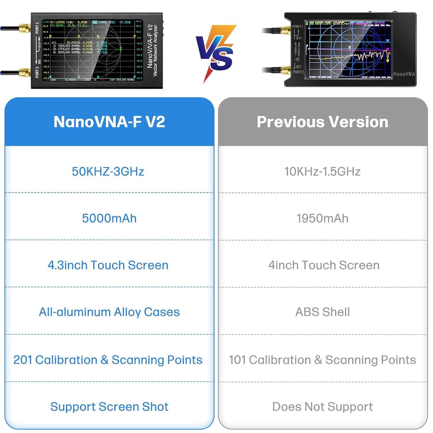 [Compact and Powerful] The nano vna f v2 features a 4.3-inch IPS LCD display (800*480) and a resistive touch screen, providing a wide viewing angle and minimizing eye strain during prolonged usage. It is equipped with an 5000mAh lithium battery for longer standby time, up to 7 hours of usage. It enables measurements of S-parameter, voltage standing wave ratio (SWR), phase map, group delay, Smith chart, DELAY, POLAR, LINEAR and more