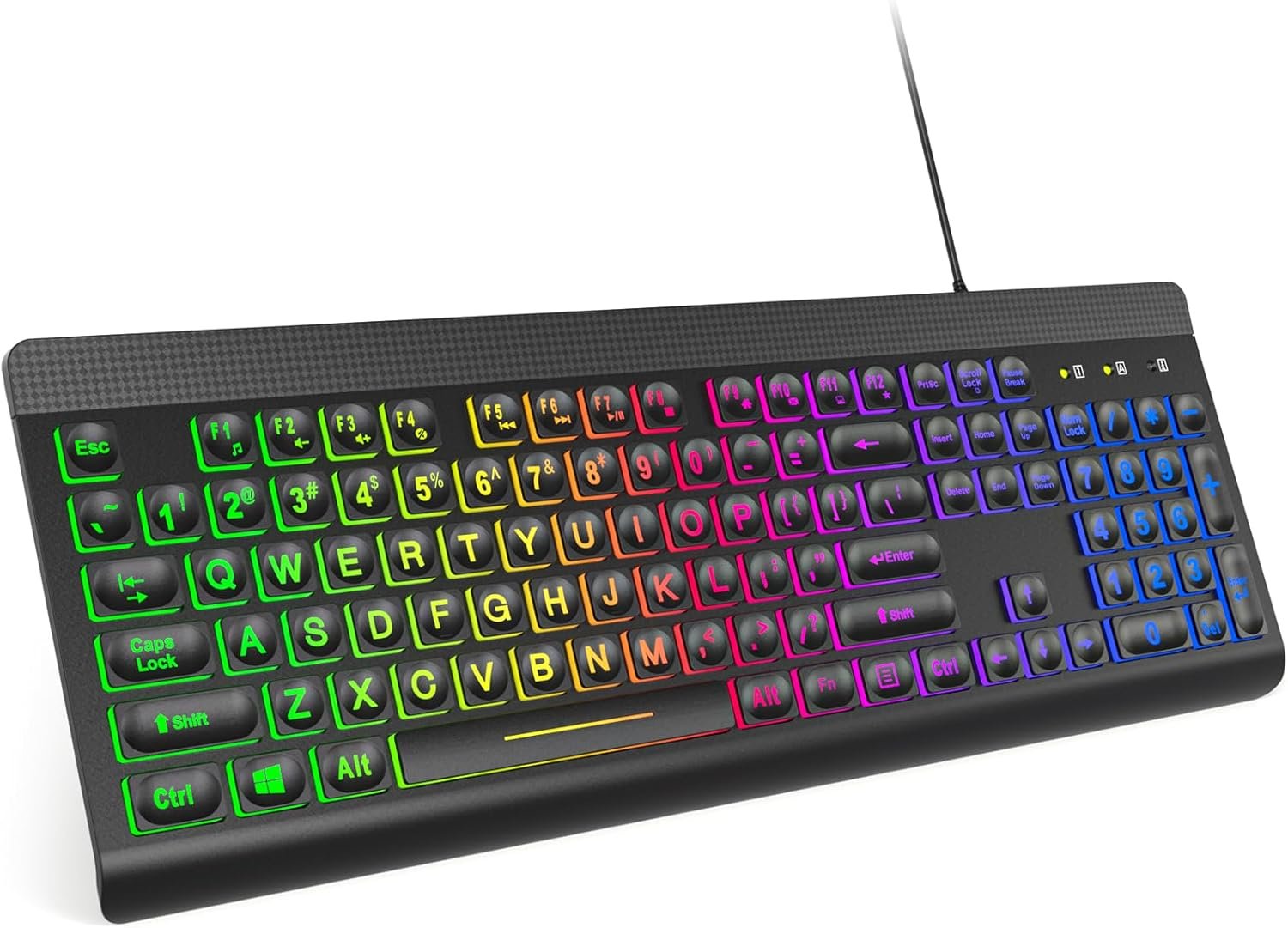 Meidosa Backlit Keyboard Wired Large Print, Computer Keyboard with Rainbow Illuminated LED, USB Keyboard with Numeric Keypad and Media Hotkey for Windows PC Laptop Large Print Keyboard:…