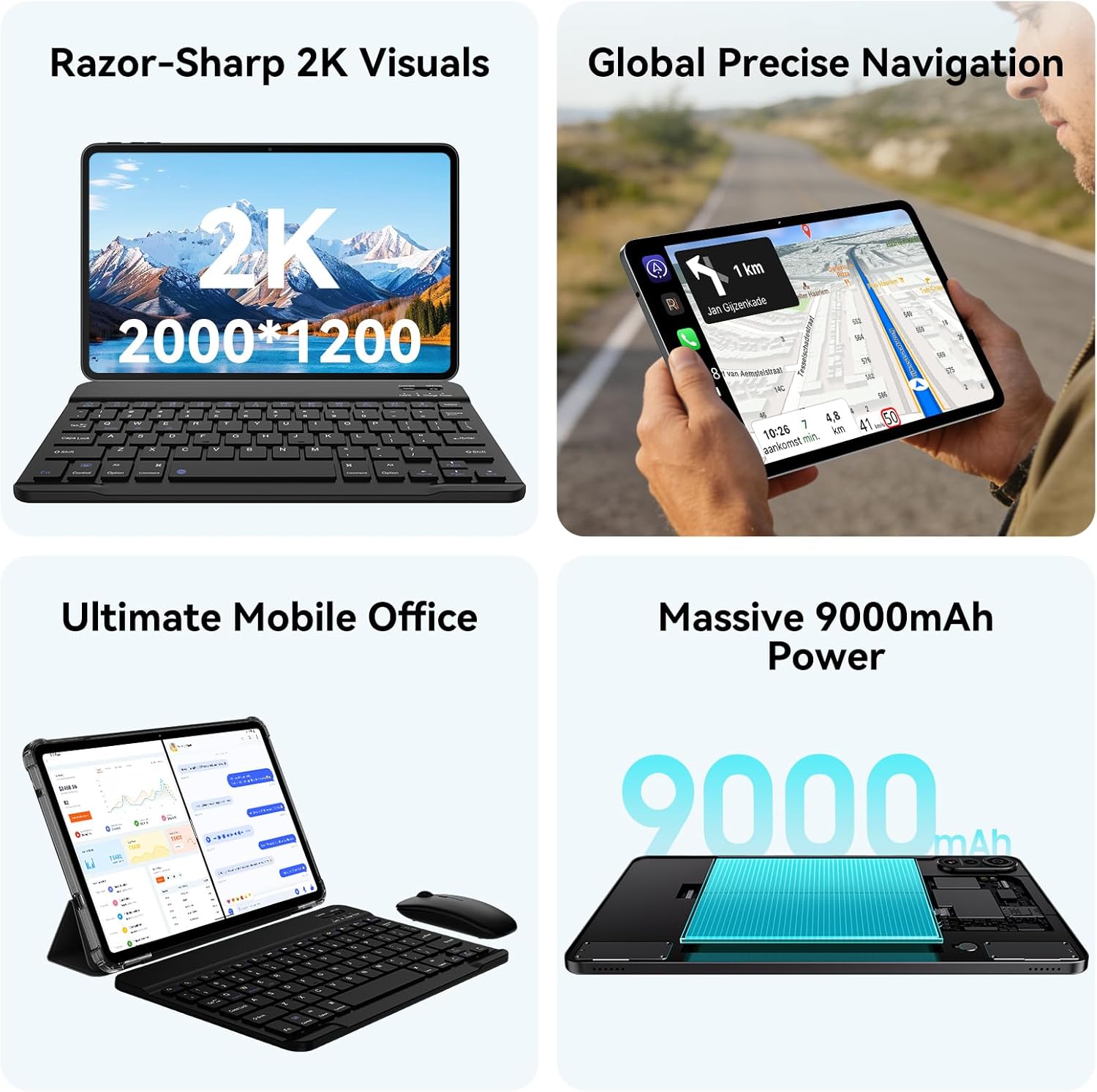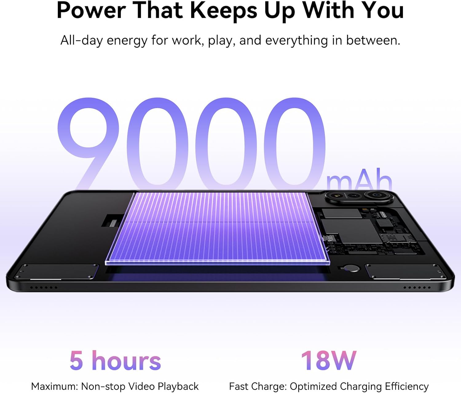 9000 mAh battery + 18W fast charging + keyboard support: The 9000 mAh battery provides long-lasting use for work, gaming, or travel. With 18W fast charging, the tablet quickly returns to full power. The included keyboard transforms it into a highly functional android tablet with keyboard, ideal for studying, office tasks, or creative projects on the go.
