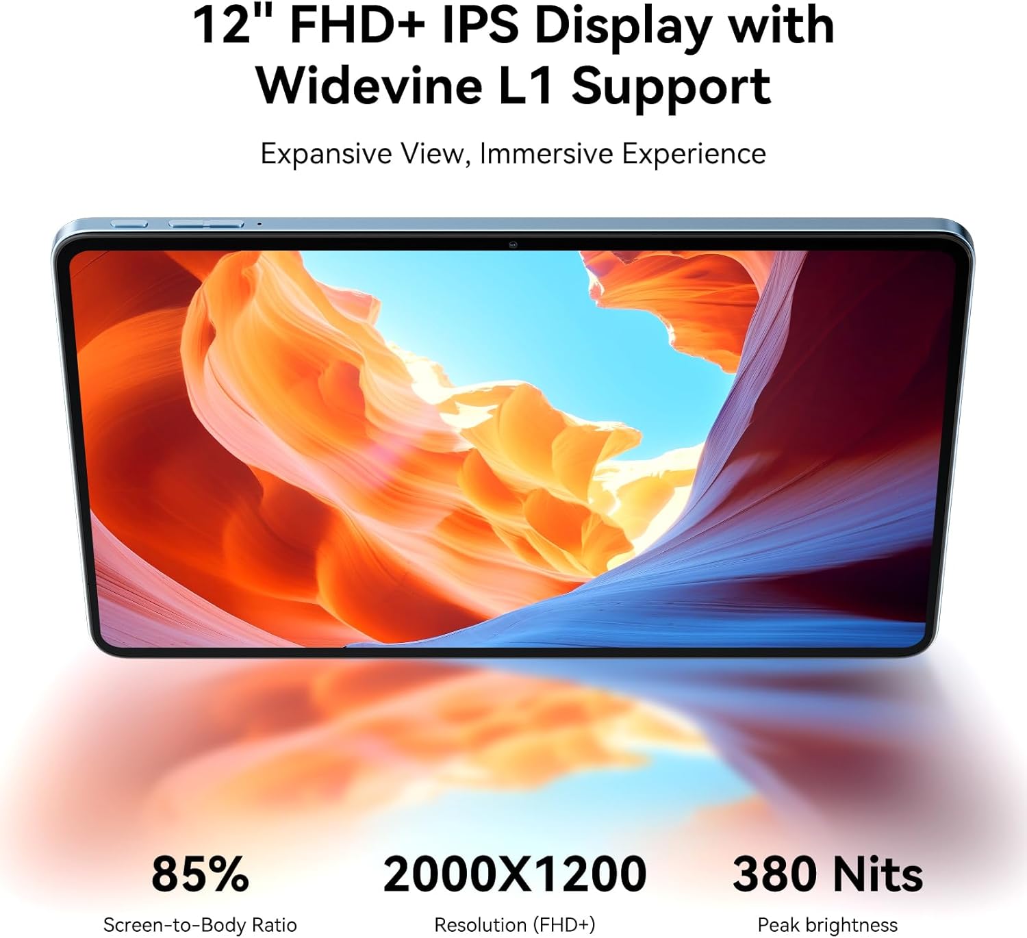 12+ inch 2K FHD+ display + stylus support: The device features a vivid 12+ inch 2K FHD+ display with crisp details, making it an ideal 12 inch tablet for gaming, streaming, drawing, and content creation. The included stylus allows precise input and creative flexibility. Widevine L1 enables HD streaming for Netflix, YouTube, Prime Video, and more. The expansive display further enhances the experience of using a large tablet, providing excellent clarity for entertainment and productivity.