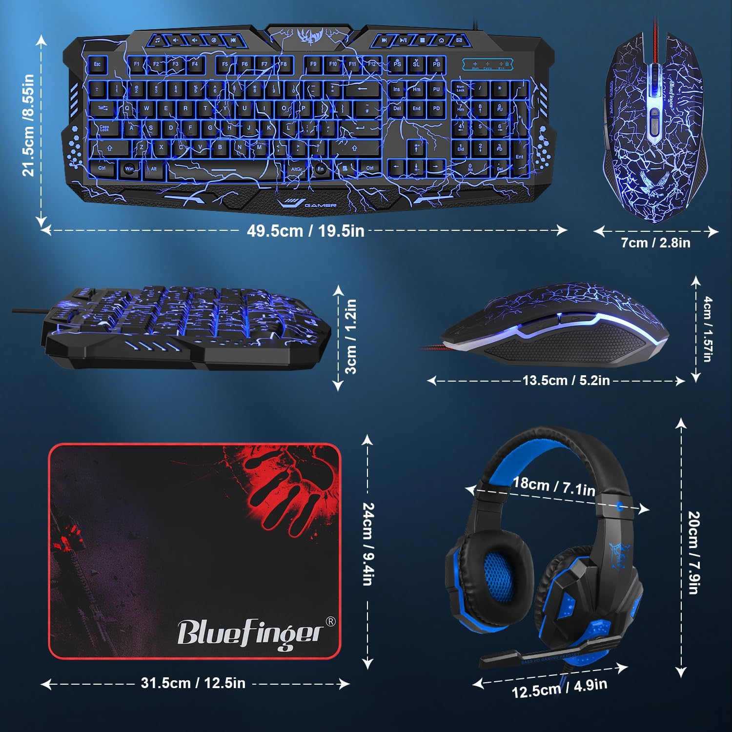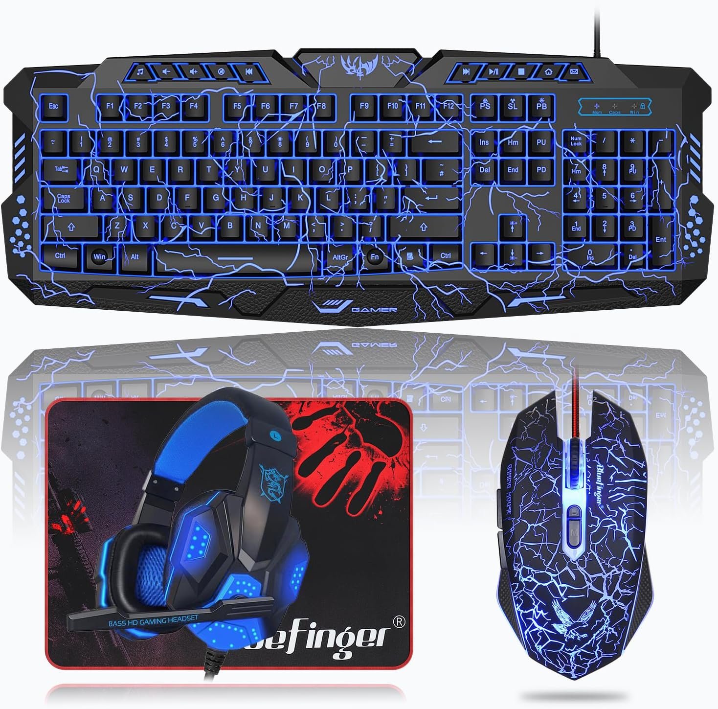 BlueFinger Backlit Gaming Keyboard, Mouse and LED Headset Combo – USB Wired 3 Color Crack