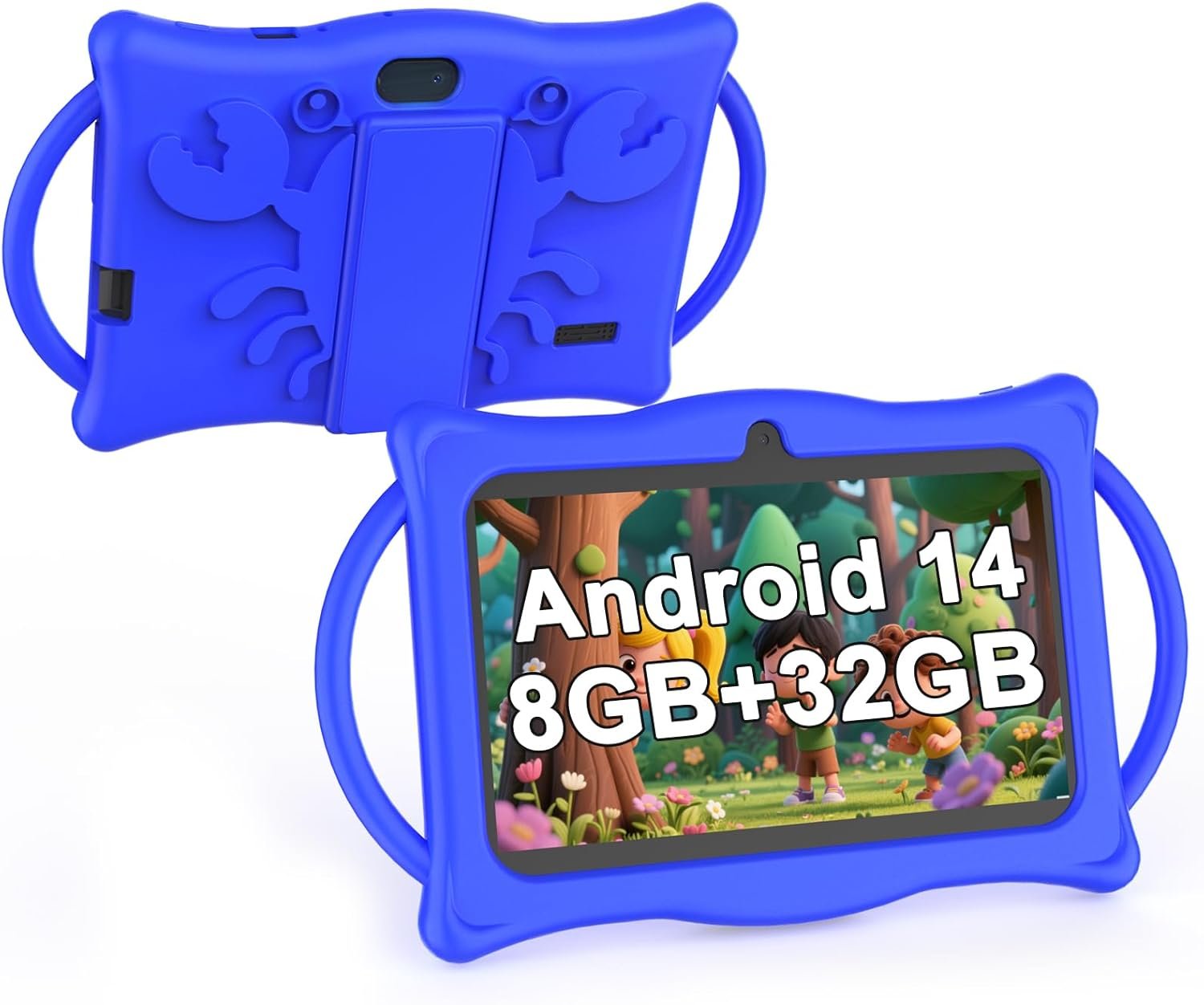 BYANDBY Kids Tablet, 7 inch Android 14 Tablet for Kids, 8GB+32GB ROM+1TB Expand Quad-Core Toddler with Shockproof Case, BT, WiFi, Parental Control, Dual Camera, Games (Blue)