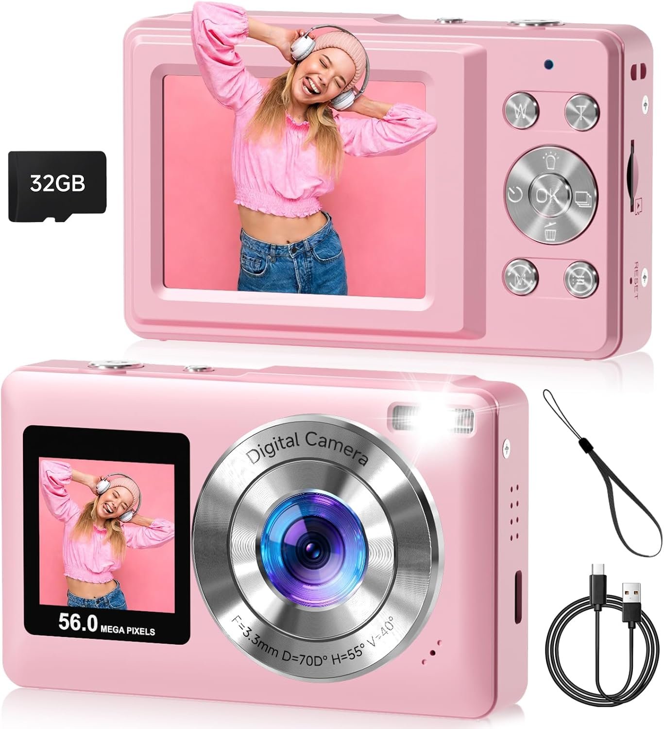 Camera Digital,56MP Dual-Screen Travel Camera with Auto Focus,Smile Capture,Anti-Shake,16X Zoom,32GB SD Card Compact Cameras Gift for Boys Girls Teens