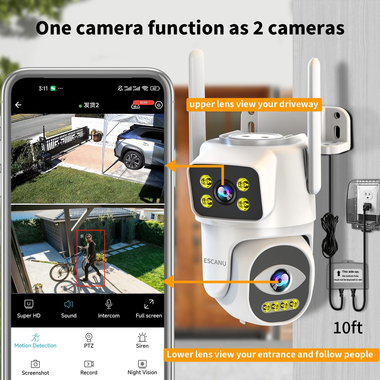 This outdoor camera come dual lens. You could move these 2 lens to view to different angle. For example one lens view back yard, one lens view to backdoor. One camera = 2 cameras. Make installation more simple.
