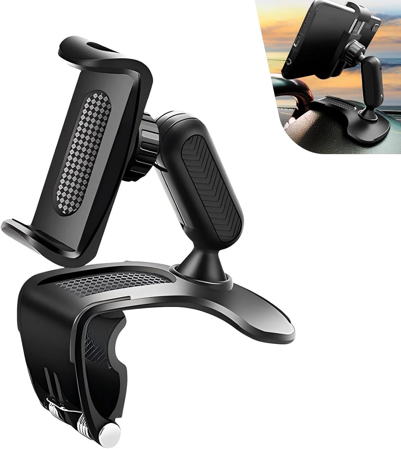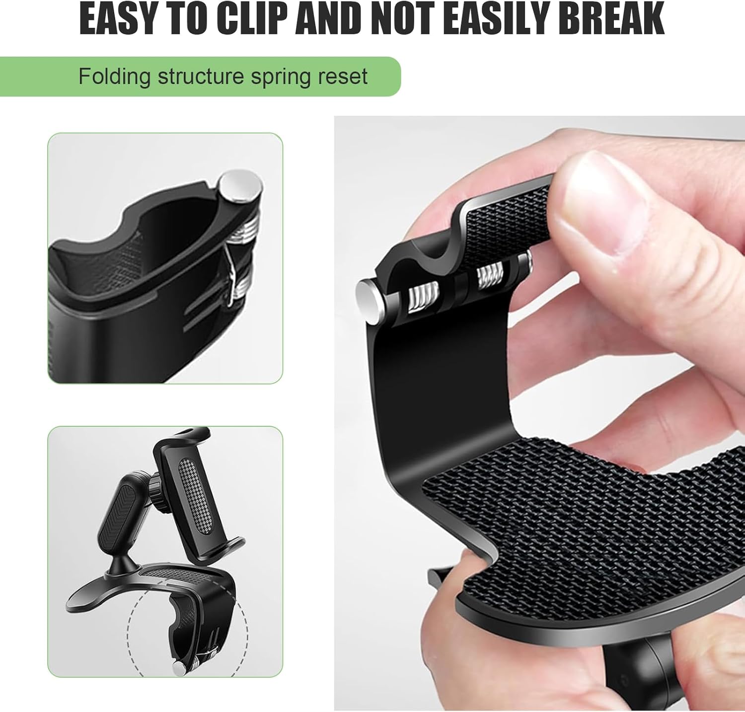 Car Phone Holder, 360 Degree Rotation Clip-on Dashboard Phone Holder, Multifunctional Mobile Phone Mount for Sun Visor & Rearview Mirror, Universal for 4-7 Inches Smartphones (Black)