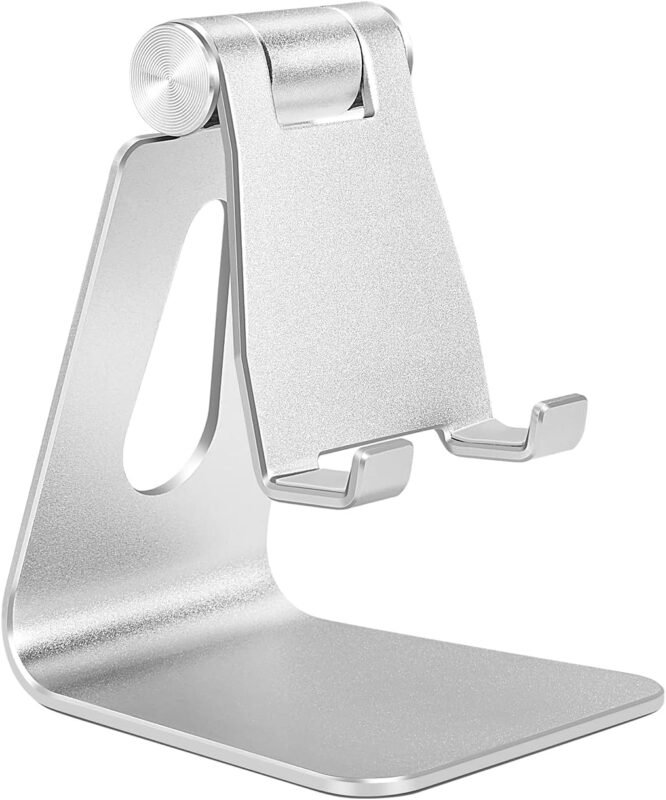 Silver Foldable Aluminum Alloy Cell Phone Holder,Tabletop Metal Phone Stand with Adjustable Angle by Swivel Axis,Smartphone Cradle
