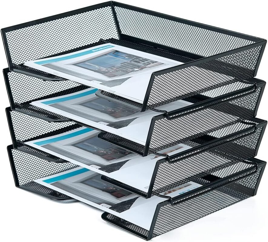 SETTFRFE 4 Tier Metal Mesh Desk Organizer-Stackable Letter Trays for Office Supplies,Black File Storage System with Reinforced Edges
