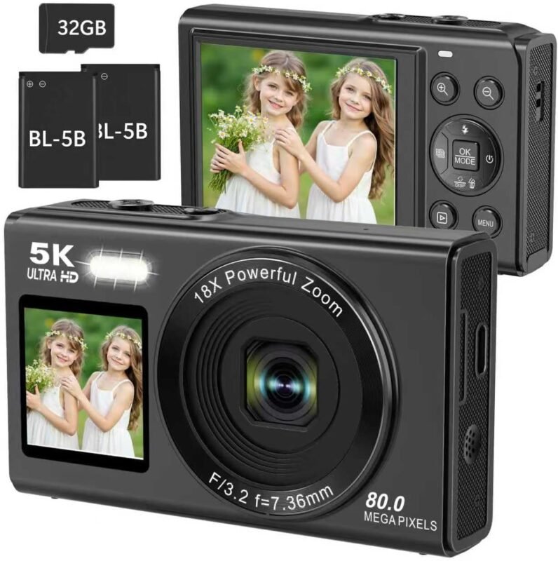 5K Digital Camera,80MP Dual Screens Digital Camera for Vlogging with 18X Digital Zoom,WiFi,Flash, Compact Camera with 32GB TF Card & 2 Batteries for Kids Teens Adult(Black)