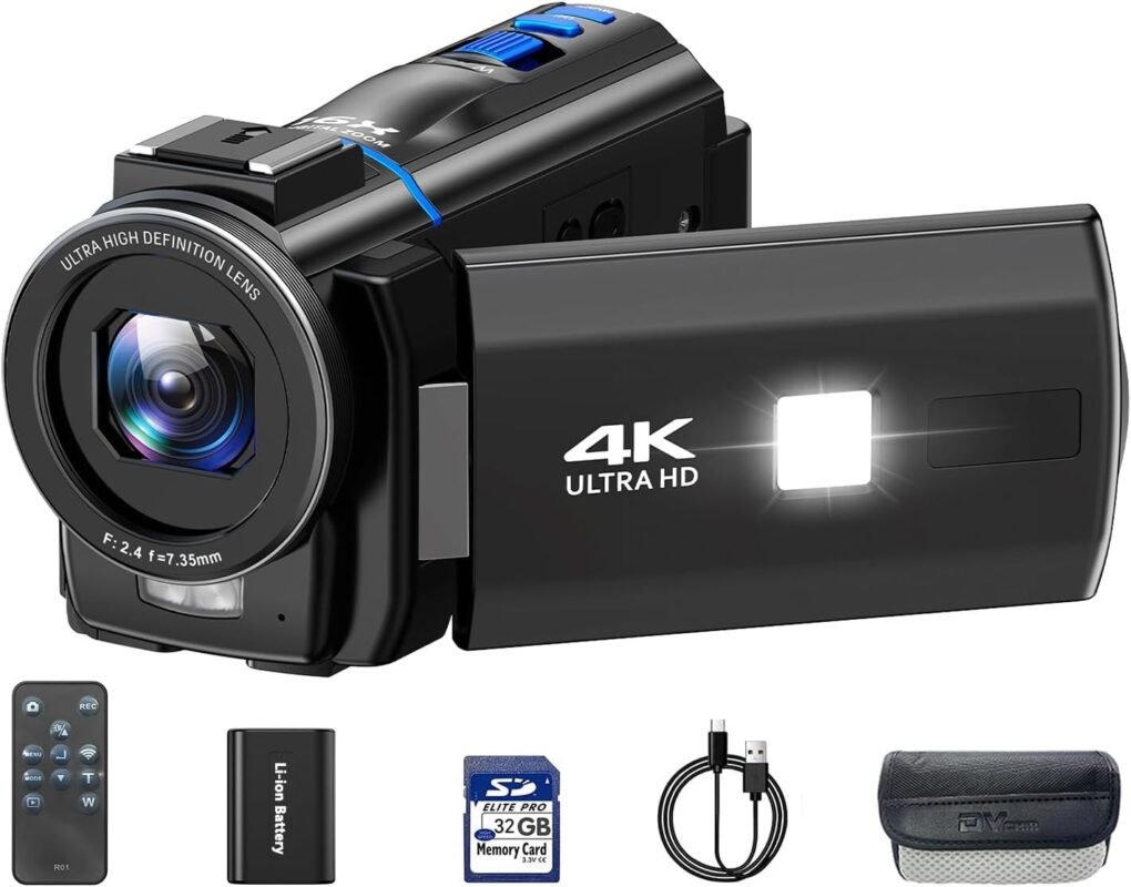 Video Camera Camcorder 4K 30fps 48MP with IR Night Vision, 16X Digital Zoom Cam Corder 3.0″ 270° Rotation Touch Screen Video Recorder for YouTube with Remote Control, Battery, 32GB SD Card