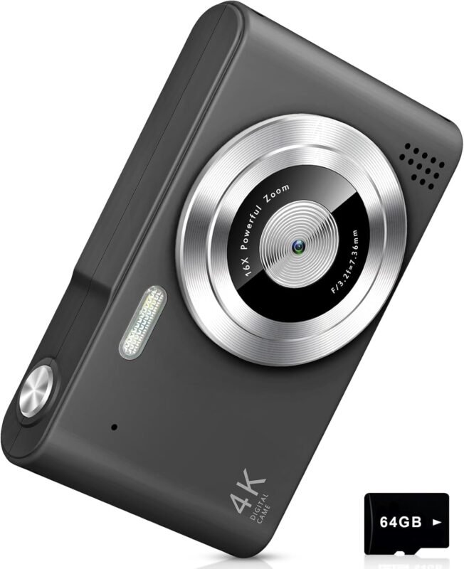 Digital Camera, Camera for Kids, UHD 4K 48MP Point and Shoot Digital Cameras with 64GB SD Card and 16X Digital Zoom Anti Shake, Compact Portable Small Gift for Boys Girls Students, Black