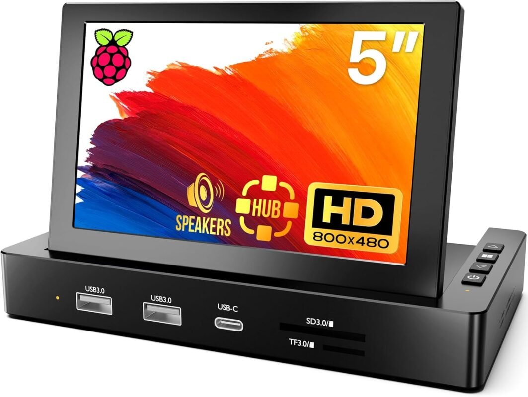 ROADOM 5” Mini Monitor with Raspberry Pi Mount Holes & USB HUB, Type-C One-Cable Connection&Speakers, All-in-One Storage Dock, Pocket IPS Screen for PC monitoring/Gaming/AIDA64/Streaming Partner
