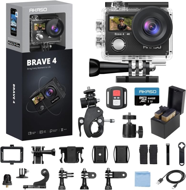 AKASO Brave 4 Action Camera 4K 30fps Ultra Hd Video 20MP Photo, EIS, WiFi Remote Control, 2X Batteries, Waterproof Underwater Camera for Snorkel, Travel, Motorcycle, Bicycle, Helmet Accessories Kit
