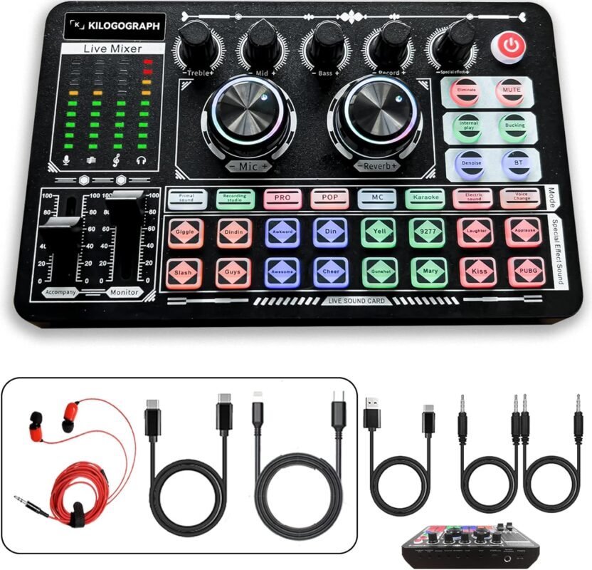 Podcast Sound Board – Music Sound Mixer with Effects, Audio Interface for PC Mac iPhone Android, Sound Card for Streaming Recording, DJ Mixer for Beginners (F999 Plus with More Cables)