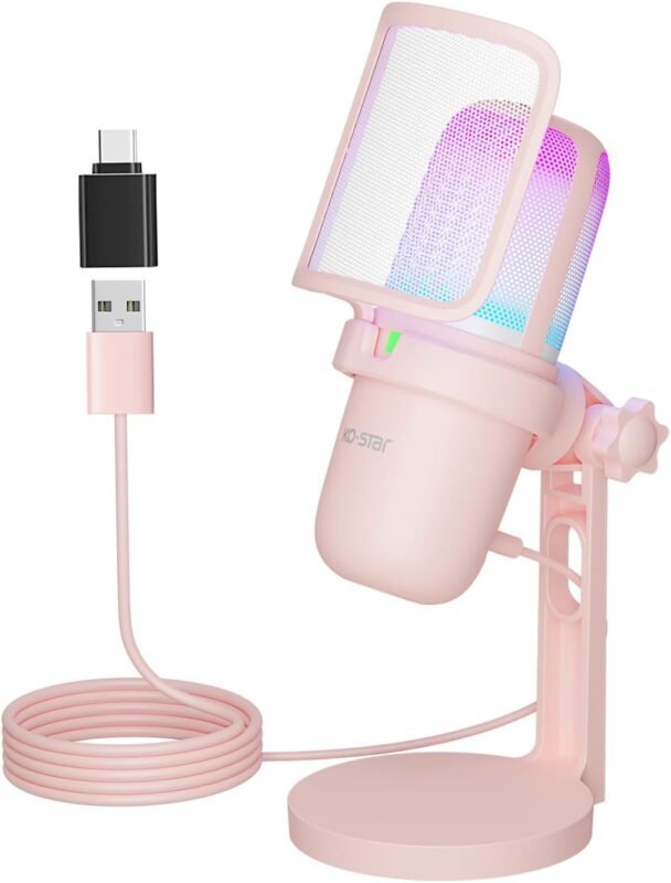 USB Microphone Gaming for PC Pink,Mini Computer Gaming Mic for PS4/ PS5/ Mac,Streaming Microphone for PC Gaming,Condenser Mic with RGB Streaming,PopFilter,Shock Mount for Recording,Podcasting