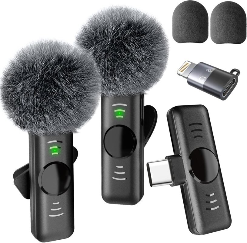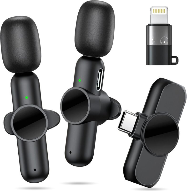Wireless Lavalier Microphone for iPhone 15/16 Android & Older iPhone – 2 Pack Universal Mini Lapel Mic with Lightning & USB-C Adapter for Video Recording TikTok YouTube Interview
