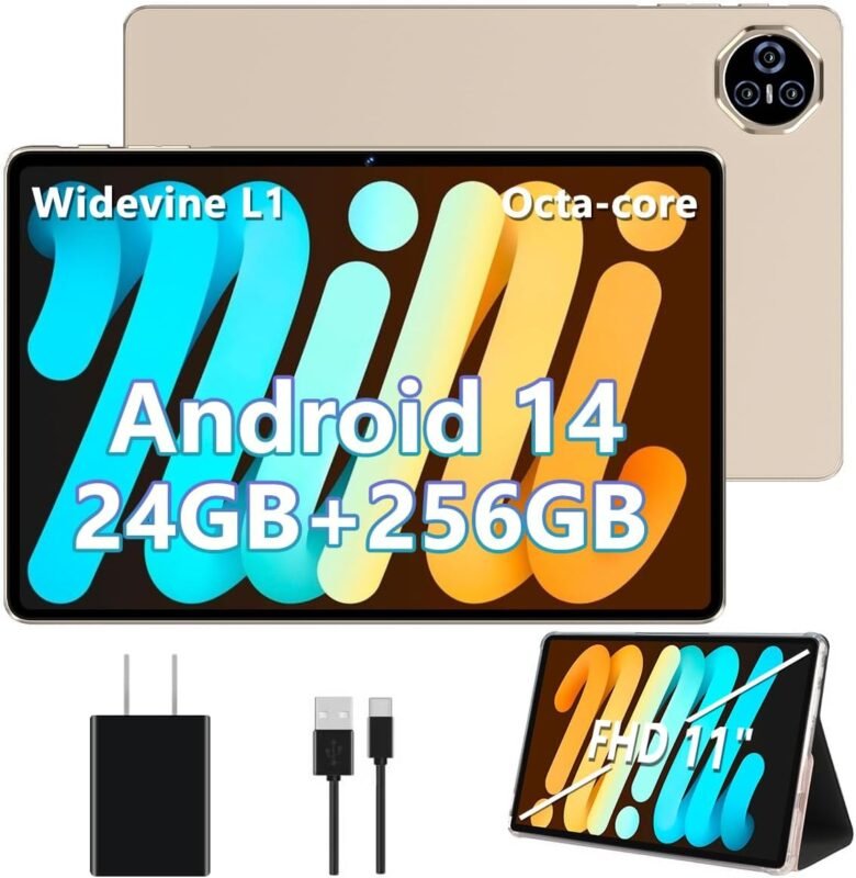 2025 11 inch Tablet, 24GB RAM+256GB ROM(2TB TF), Android 14 Tablets with 8000mAh Battery, (13+5) MP Camera, Supports Widevine L1, 5G WiFi, GPS, BT5.0, Tablet with Case -Gold