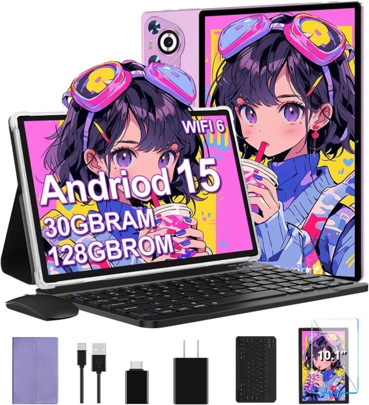 Android 15 Tablet, 30GB RAM + 128GB ROM 1TB TF, 2025 Tablet with Keyboard and Mouse, 10.1 inch Touchscreen, 8000mAh Battery, Incell Display, 2.0GHz, Gemini AI, 5G WiFi, BT 5.0, GPS – Metal Purple