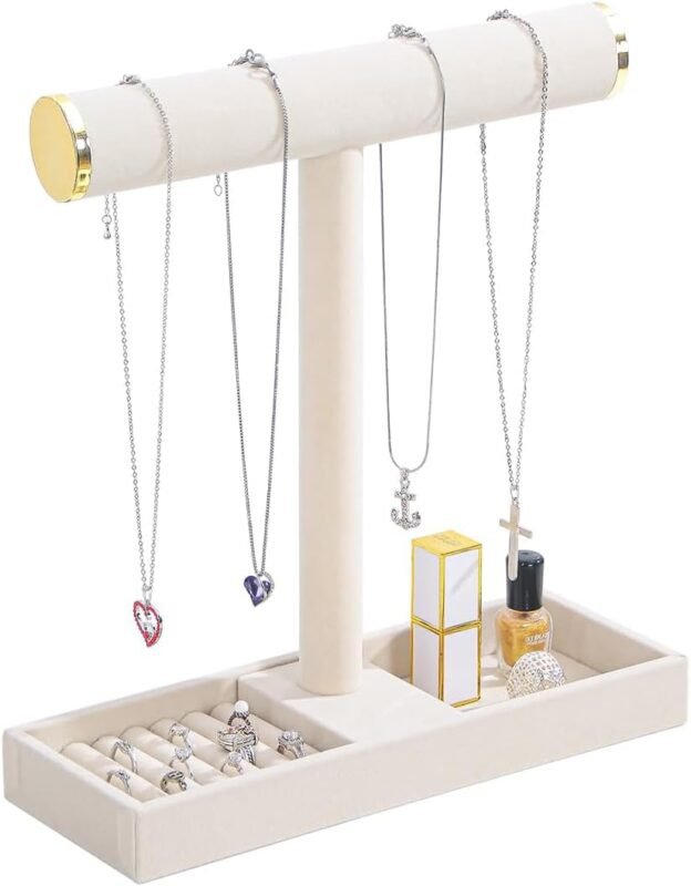 Coward Jewelry Organizer Stand, Velvet Necklace Bracelet Watch Ring Display Holder with Tray, Multi-use Jewelry Display Stand for Women Girls Dresser Nightstand (Beige)