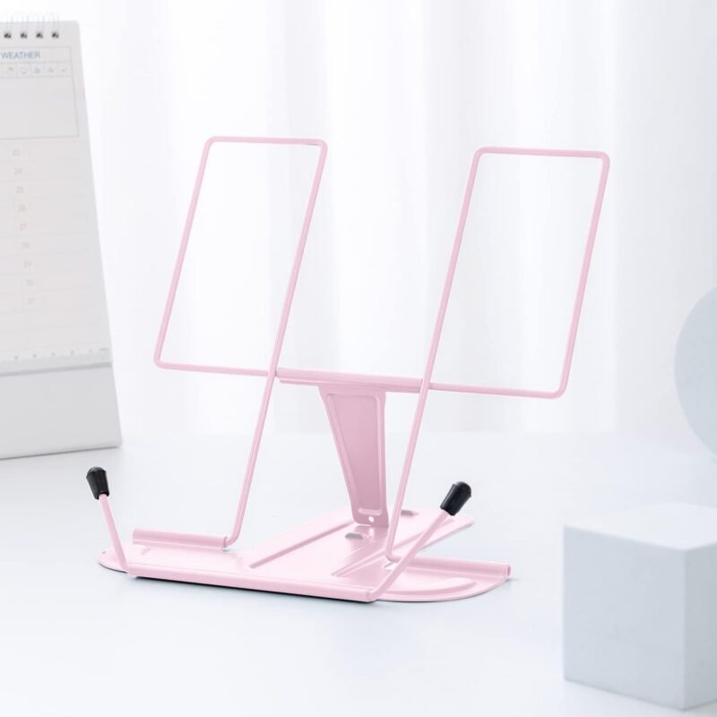 MSDADA Metal Book Stand for Desk, Adjustable Reading Rest Book Holder, Portable Cookbook Documents Holder, Sturdy Typing Stand for Recipes Textbooks Tablet Music Books with Page Clips (Macaron Pink)