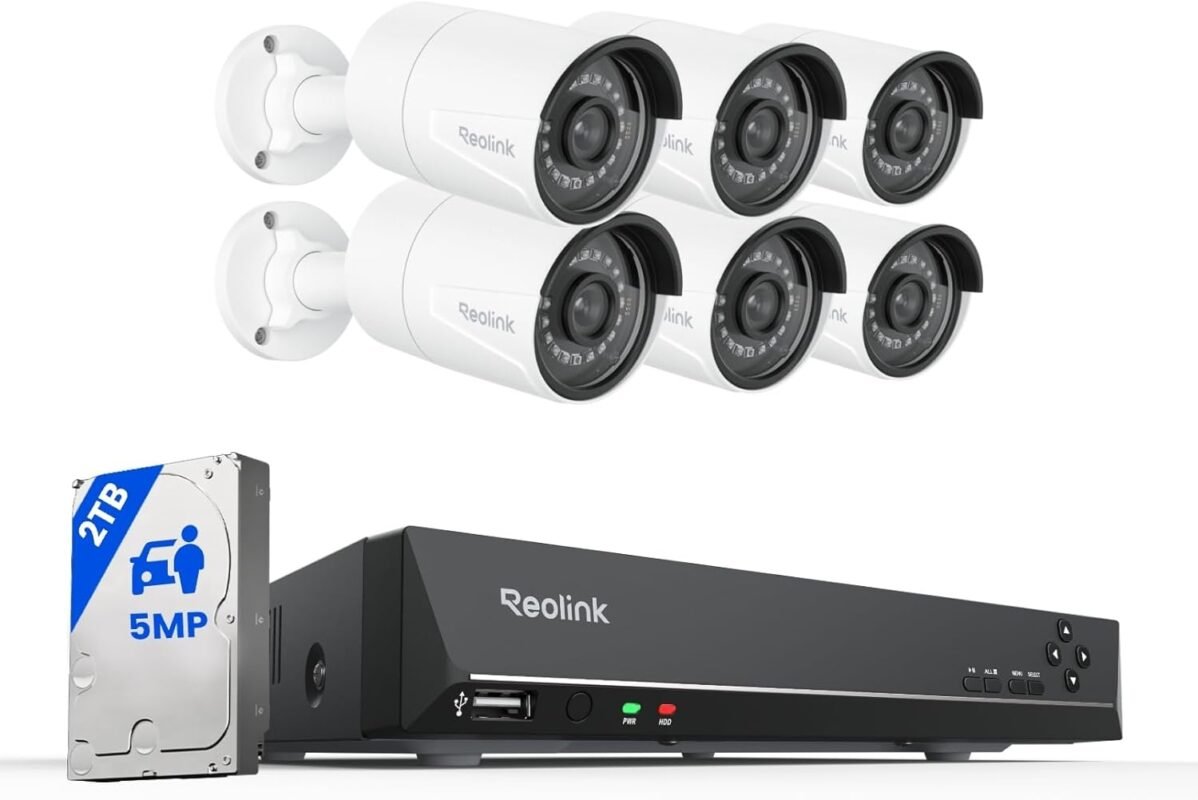 REOLINK 8CH 5MP Home Security Camera System, 6pcs Wired Outdoor PoE IP Cameras with Person/Vehicle/Pet Detection, 4K/8MP 8CH NVR with 2TB HDD for 24-7 Recording, RLK8-410B6-5MP