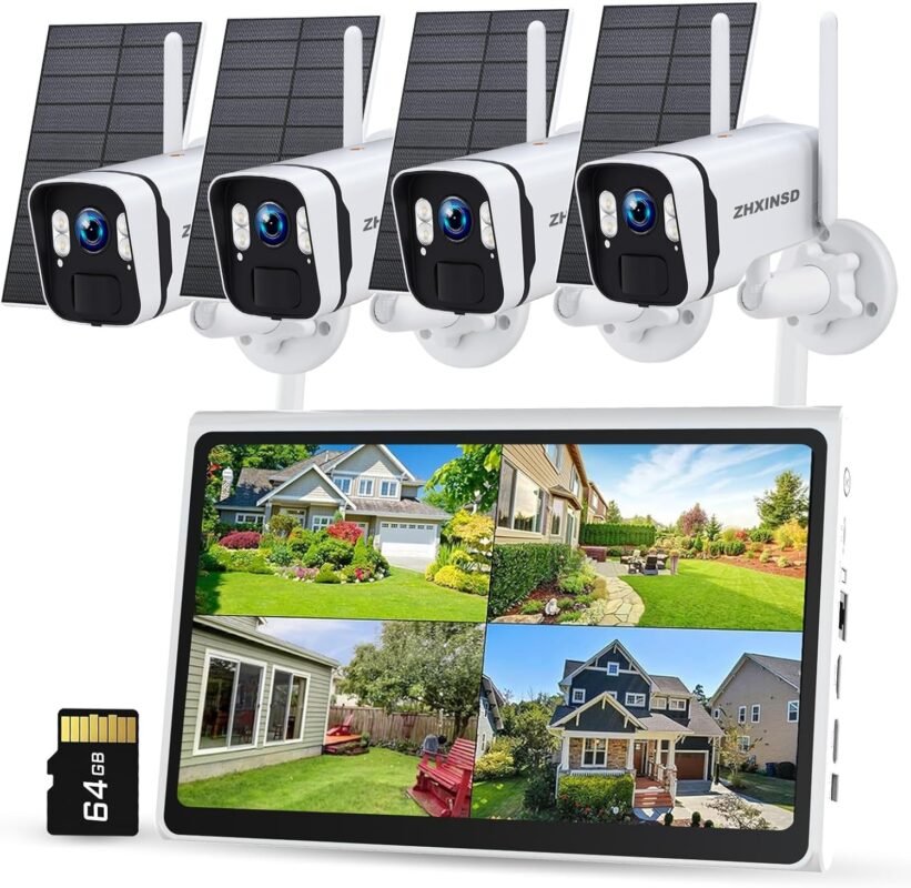 4MP Solar Powered Security Camera Outdoor Wireless System with 10″ Monitor, 5G/2.4G WiFi 4PCS Outdoor Battery Camera with Solar Panel10CH Home Security System AI Human Detection 2-Way Audio