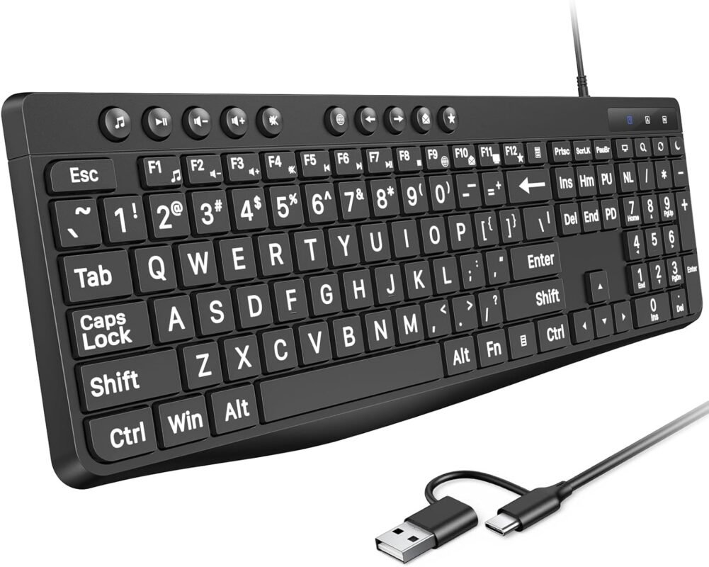OMOTON Large Print Computer Keyboard Wired with Type-C and USB A Dual Interface, Full Size