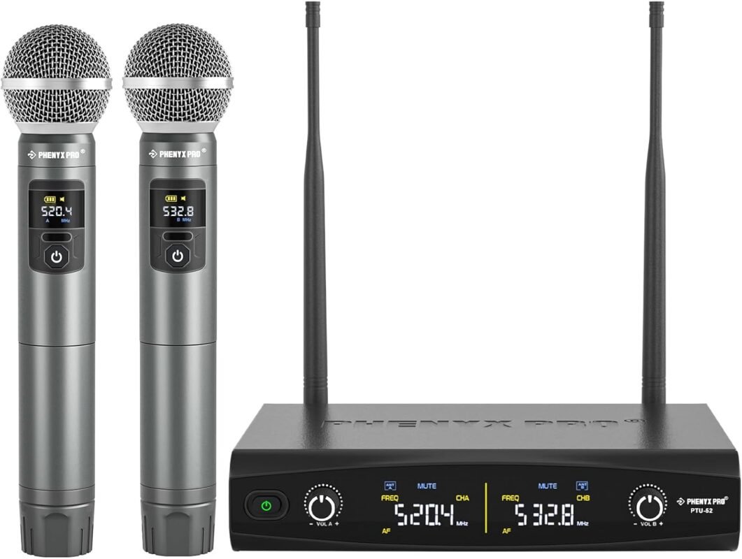 Phenyx Pro Wireless Microphone System, Metal Wireless Mic Set, Handheld Cordless Dynamic Microphones for Singing, Karaoke, Church, 2×30 UHF Tunable Frequencies,200 ft Range (PTU-52-2H)