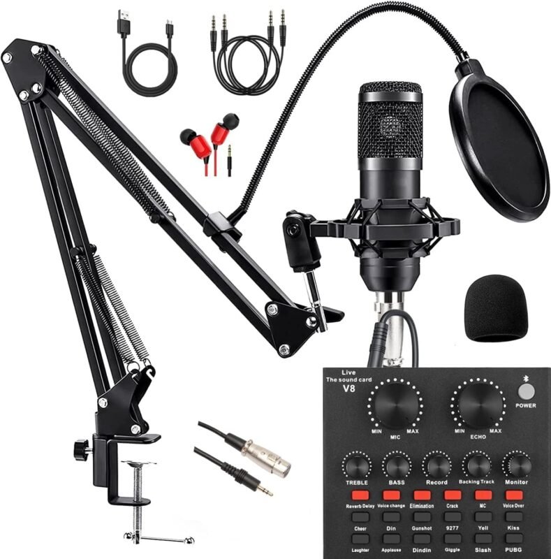 Podcast Equipment Bundle, with BM800 Podcast Microphone and V8 Sound Card, Voice Changer – Audio Interface -Perfect for Recording, Singing, Streaming and Gaming (V8-Black)