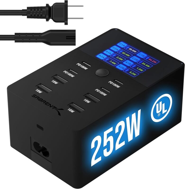 SABRENT Charger, 252W 8-Port Desktop Charging Station w/Real-Time LCD Display, UL Certified | USB C/A, Compatible with MacBook, iPhone, Samsung Galaxy, and Tablets