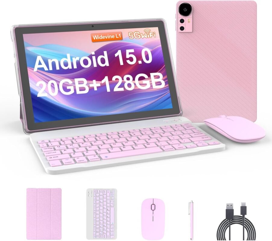 Tablet 10.1Inch Android 15.0, RAM 20GB(4+16Expand)+ROM 128GB, 6000mAh Battery, 2+8MP Dual Camera, 1280 * 800 IPS HD Touch Screen Tab PC Set with Keyboard+Mouse+Protective Case+Stylus (Pink)