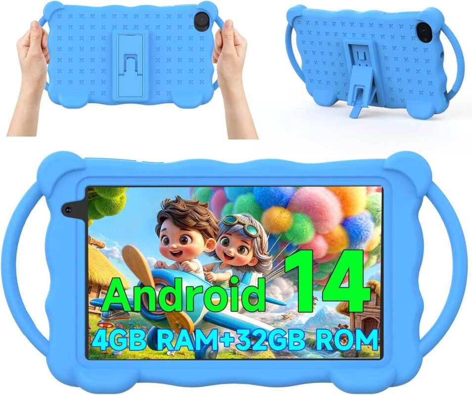 Kids Tablet 7 inch Android 14.0 for Toddler, 4GB RAM 32GB ROM Bluetooth IPS Screen Google Play YouTube Parental Control Dual Camera Shockproof Case for Educational Games (Blue)