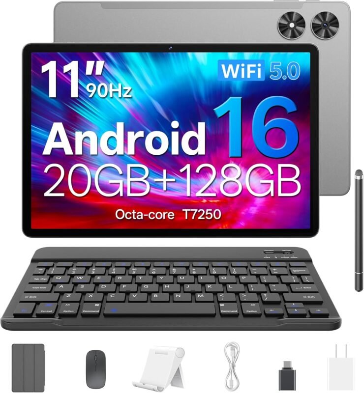 Android 16 Tablet, 2025 Upgraded 11 inch Android Tablets with Keyboard, 20GB+128GB+1TB Expand, Support Face Unlock+Widevine L1 Supported, Octa-Core CPU,Dual WiFi, Dual Camera,8800mAh Battery, Silver