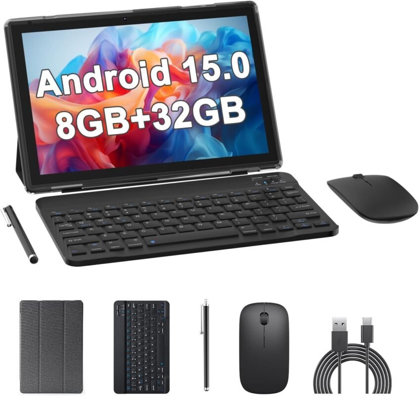 Android 15 Tablets 10 Inch, 2 in 1 Tablet with Keyboard Case, 8GB+32GB ROM/1TB, Quad Core, HD Touch Screen, Dual Carema, Games, Wi-Fi, BT, Google GMS Black