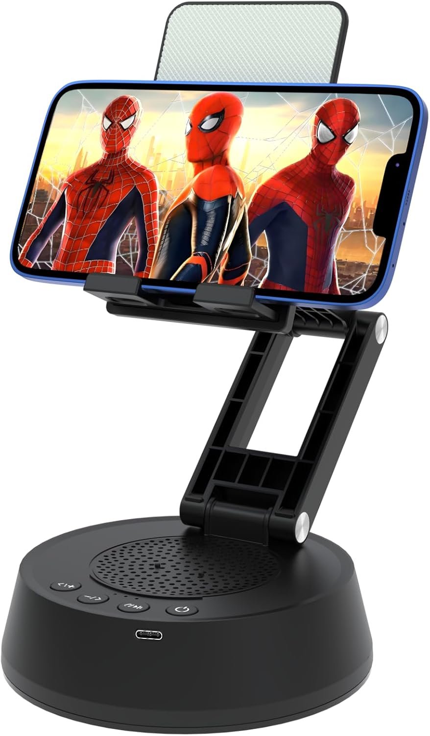 Cell Phone Stand with Wireless Bluetooth Speaker,Adjustable Height and Angle Foldable Cell Phone Stand Holder Bluetooth Speaker for Desk, Phone Stand Compatible with 4.7″-13″ Smartphones(Black)