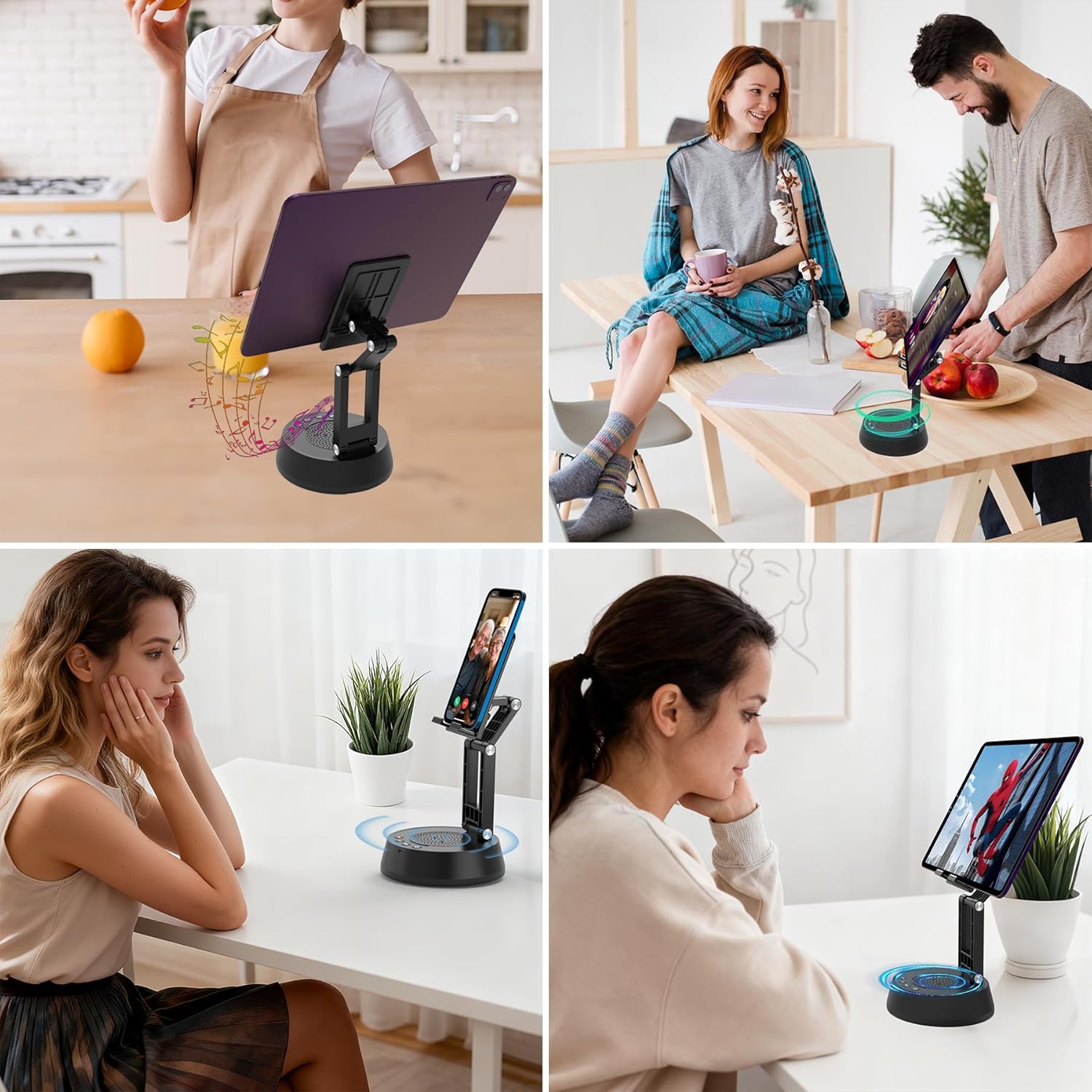 Cell Phone Stand with Wireless Bluetooth Speaker,Adjustable Height and Angle Foldable Cell Phone Stand Holder Bluetooth Speaker for Desk, Phone Stand Compatible with 4.7″-13″ Smartphones