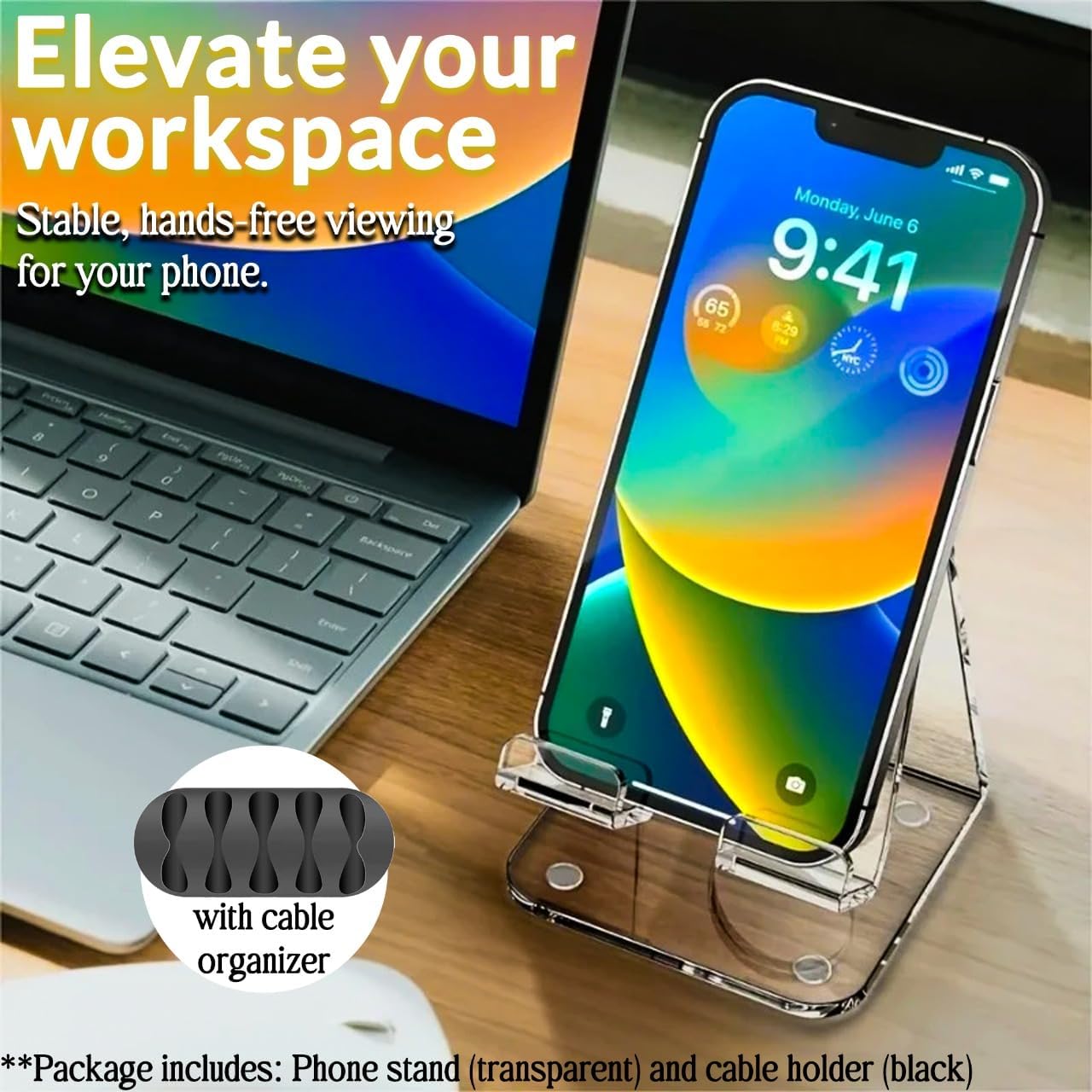 Clear Acrylic Phone Stand with Cable Clip, Transparent Desktop Phone Holder for iPhone & Android, Sleek Portable Display Stand with Cable Organizer for Desk, Office & Home