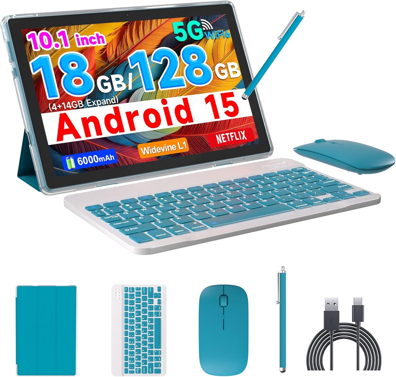 COOPERS Tablet Android 15, 10 inch Tablet 18GB RAM+128GB ROM 2TB Expandable, 2.0Ghz Quad-core Processor, 5G WiFi6 BT 5.0, Dual Cameras, 2 in 1 Tablets with Keyboard Case Mouse Stylus, Widevine L1 Blue