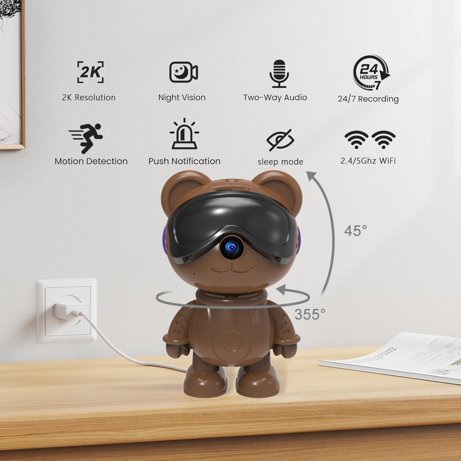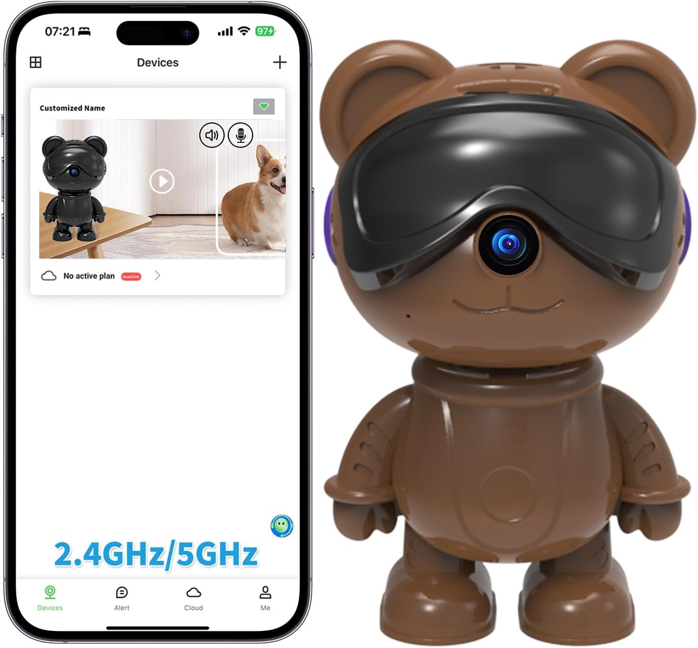 Cute Bear 2K Robot & Pet Camera – Hidden Indoor Security, Motion & Baby Cry Detection, Privacy Mode, 5G Dual-Band, Pan & Tilt, Full HD Night Vision, 24/7 Recording, 2-Way Audio