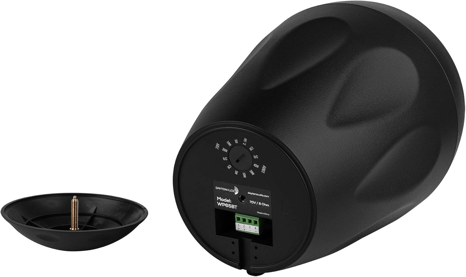 Mounting hardware includes a fully enclosed end cap protecting the transformer tap selection and phoenix wire connector. The speaker connects to a ball joint mount for both vertical and horizontal axis configuration.