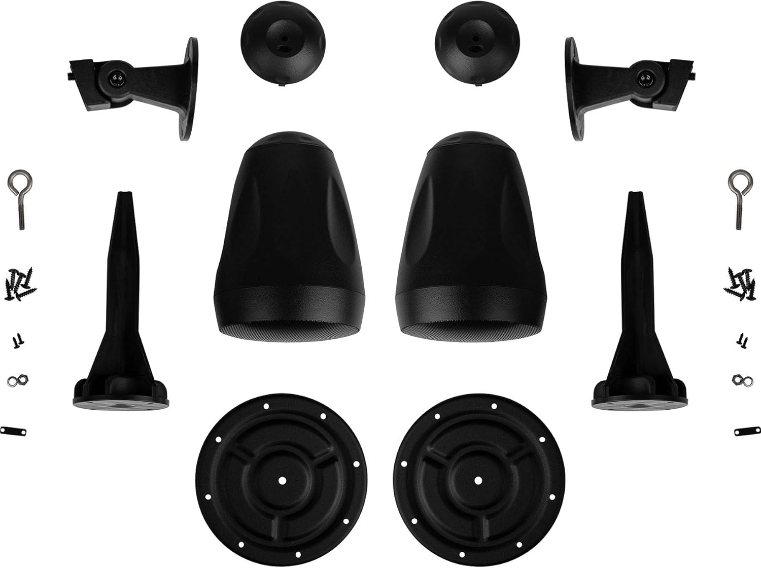 Mounting hardware includes a fully enclosed end cap protecting the transformer tap selection and phoenix wire connector. The speaker connects to a ball joint mount which is attached to a landscape style stake providing sturdy support for the speaker