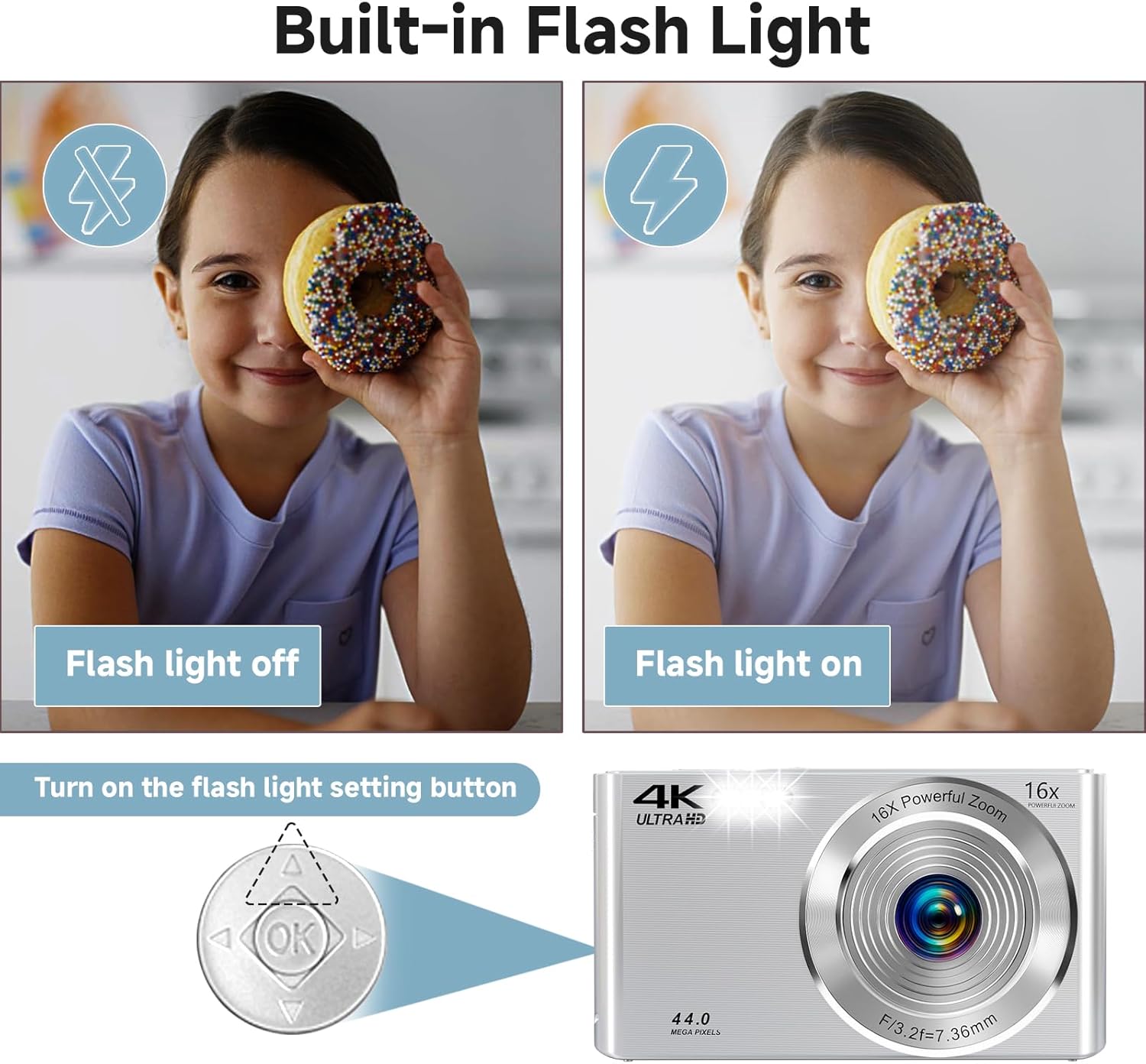 Vlog Webcam and Upgraded Fill Light:The digital camera with video can be used as a live webcam, the pause function allows you to pause while recording. Built in 3 flash bulbs make the illumination brighter, helping you take clear photos even in low light