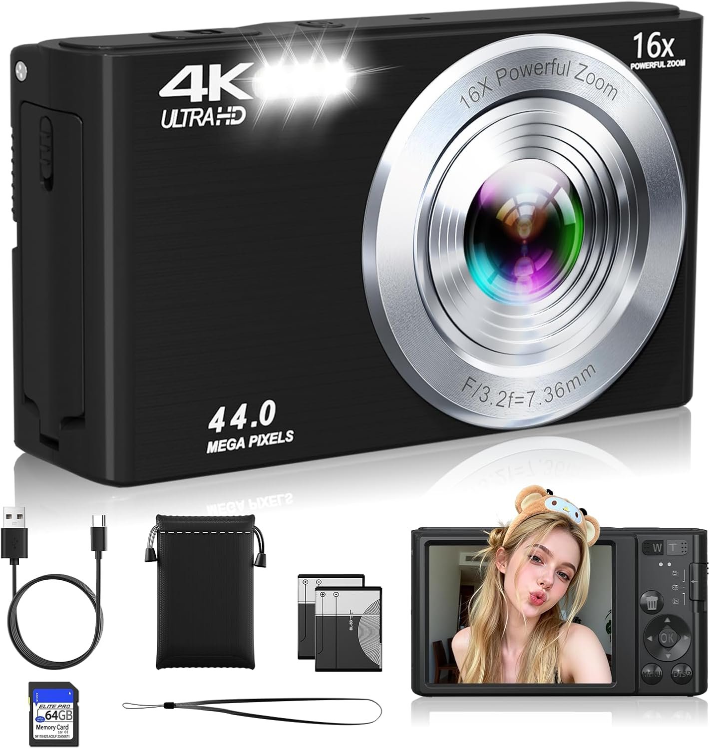 FHD 4K Digital Camera for Photography: The compact camera support premium 44MP photos and 4K HD video recording. Advanced CMOS technology ensures precise detail,capture vivid picture for preserving your every important moment.The 16x digital zoom point and shoot camera is ideal for beginners to capture distant scenery.